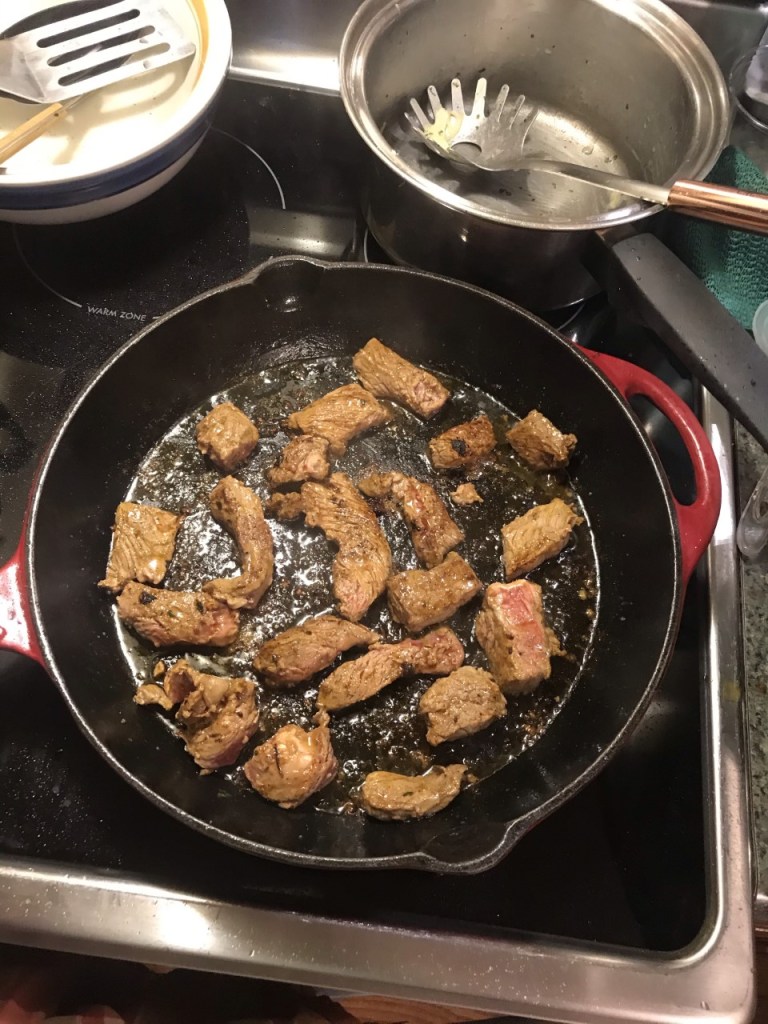 5. Keep your skillet on Medium heat and add 2 tbsp of butter and garlic. Let the butter melt completely!! Once your butter has melted you can start cooking the steak strips. The bowl you used to marinate the steak should have left over marinade if you add that to the skillet it will give the steak and potatoes extra flavor!