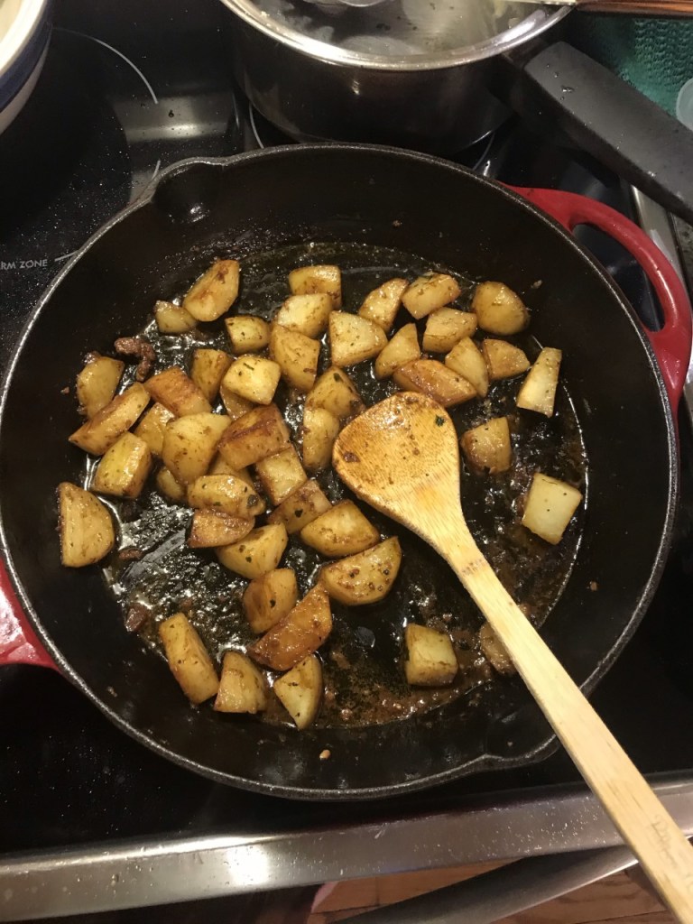 - Cook the potatoes for 8 minutes, then put them on a plate and wrap with foil. If they don’t look fully cooked still wrap them up. Eventually they will get added back to the skillet.